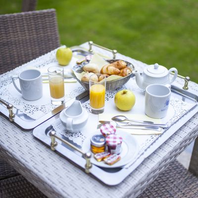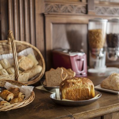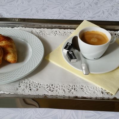 Boisson chaude, jus d’orange ou pomme, pain et viennoiseries.